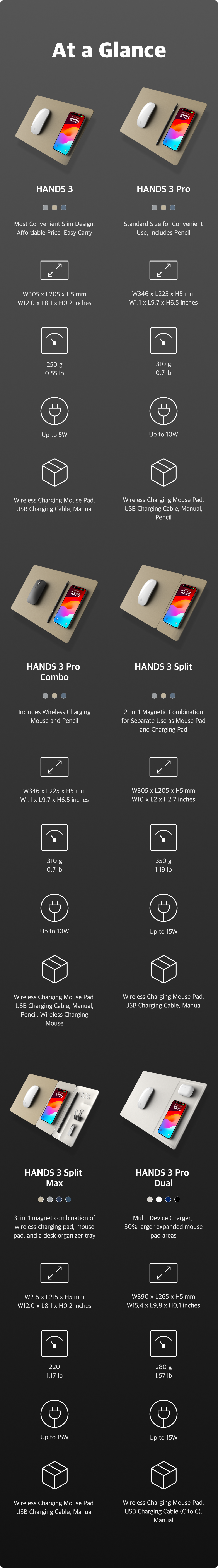 A sleek 3-in-1 mouse pad, organizer tray, and detachable 15W fast wireless charger with a modular design for flexible positioning. The detachable charging pad offers standalone use, while the organizer tray keeps essentials tidy, maximizing desk space. Perfect for right- and left-handed users.